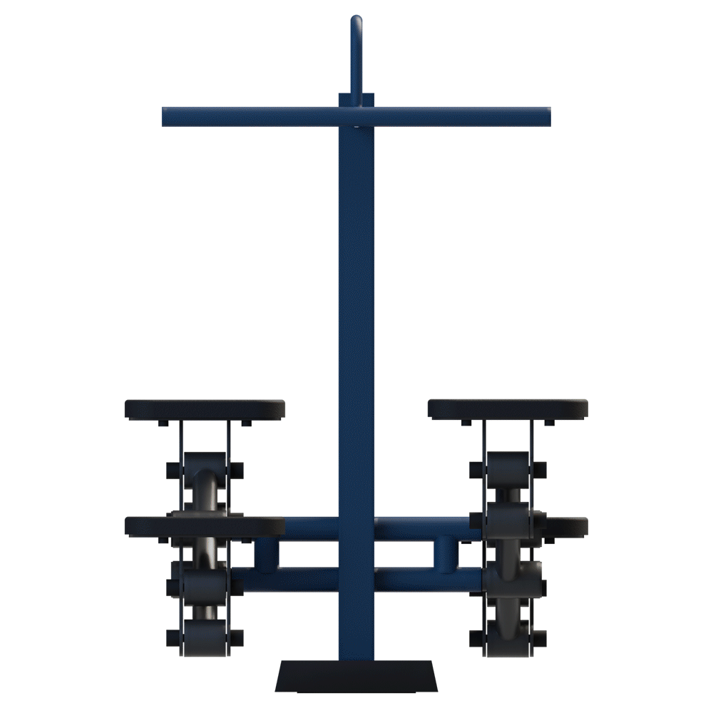 The equipment is designed for cardiovascular exercise, warm-up, and leg muscle development. Two people can exercise simultaneously.