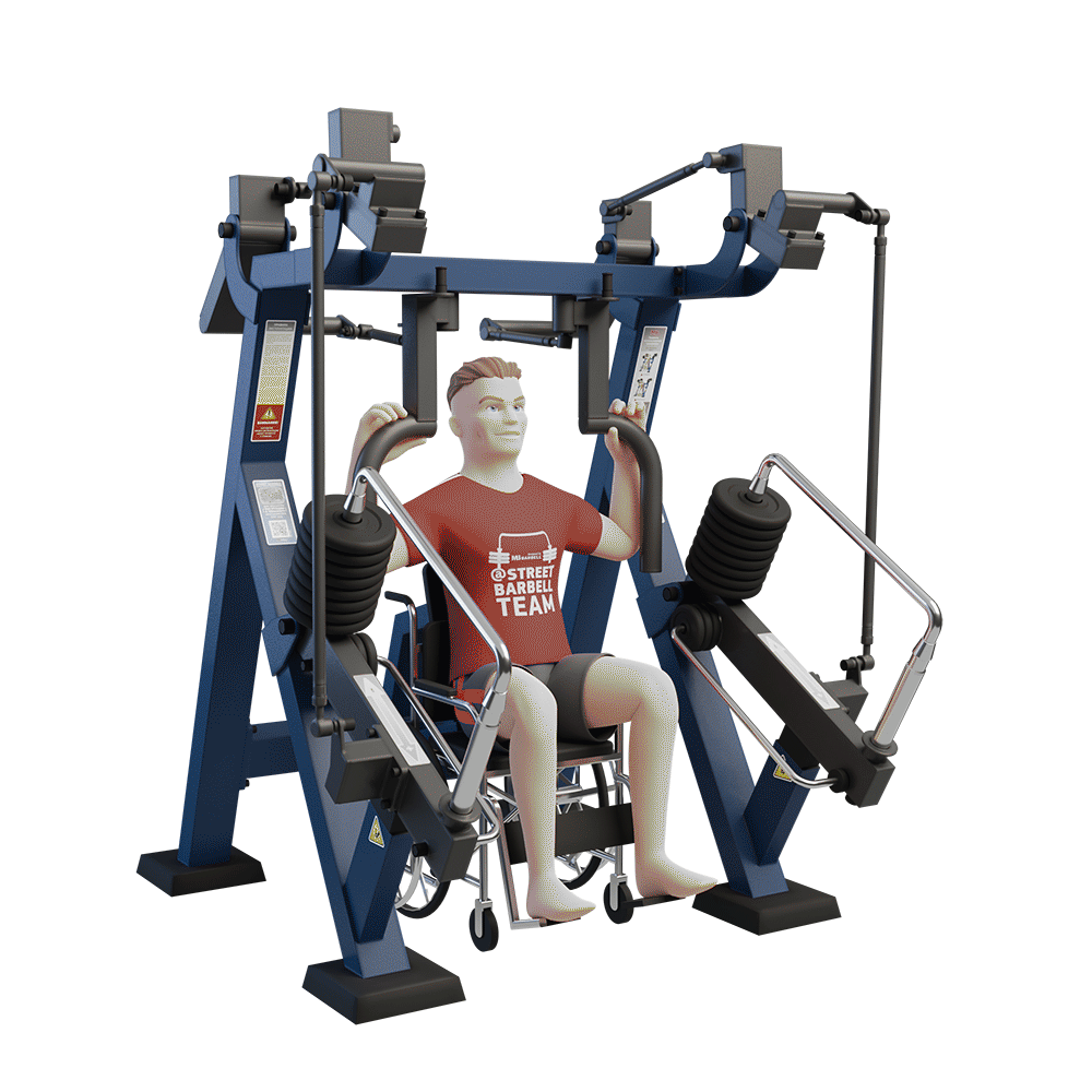 The trainer is designed for training the chest muscles. The design of the trainer allows individuals in wheelchairs to use it.