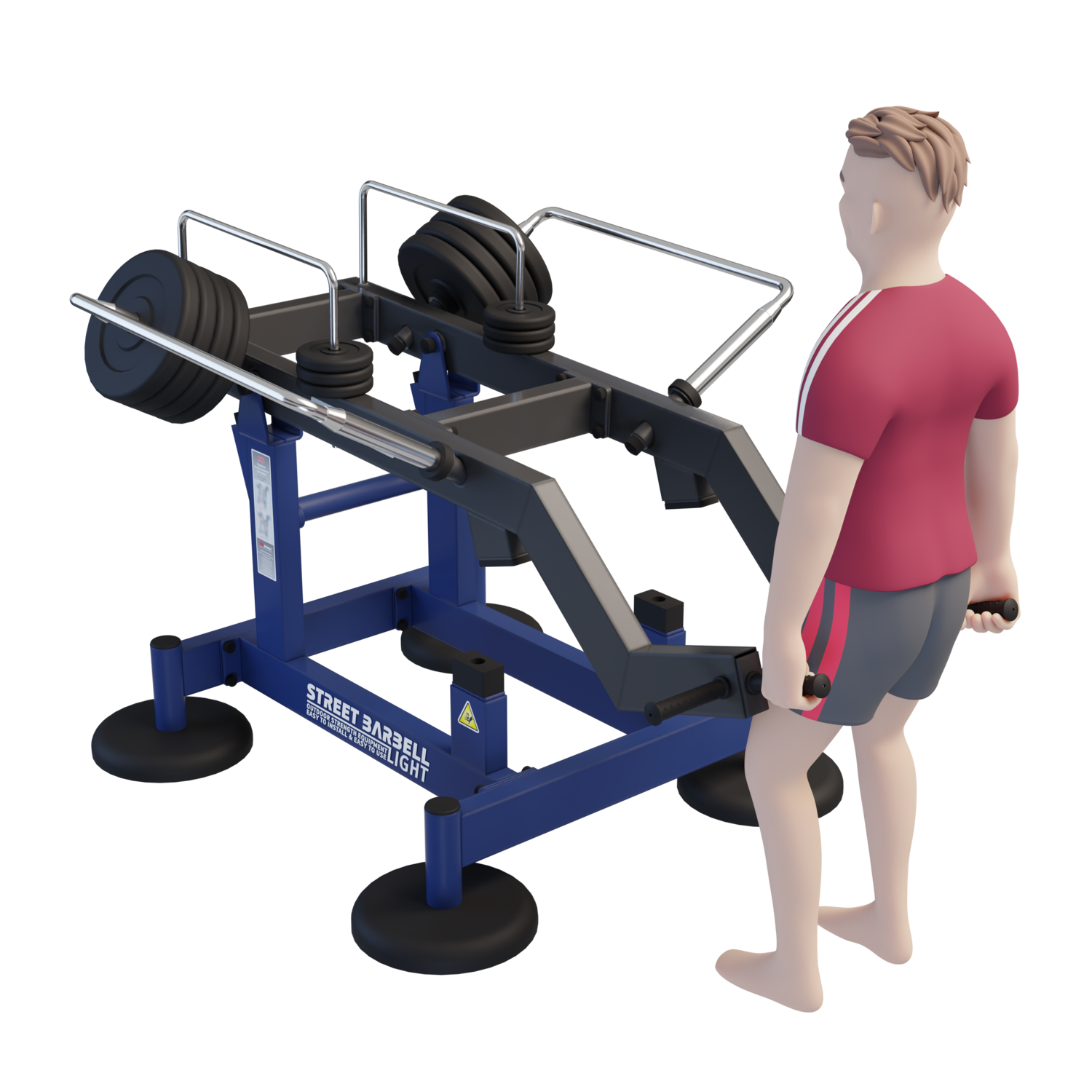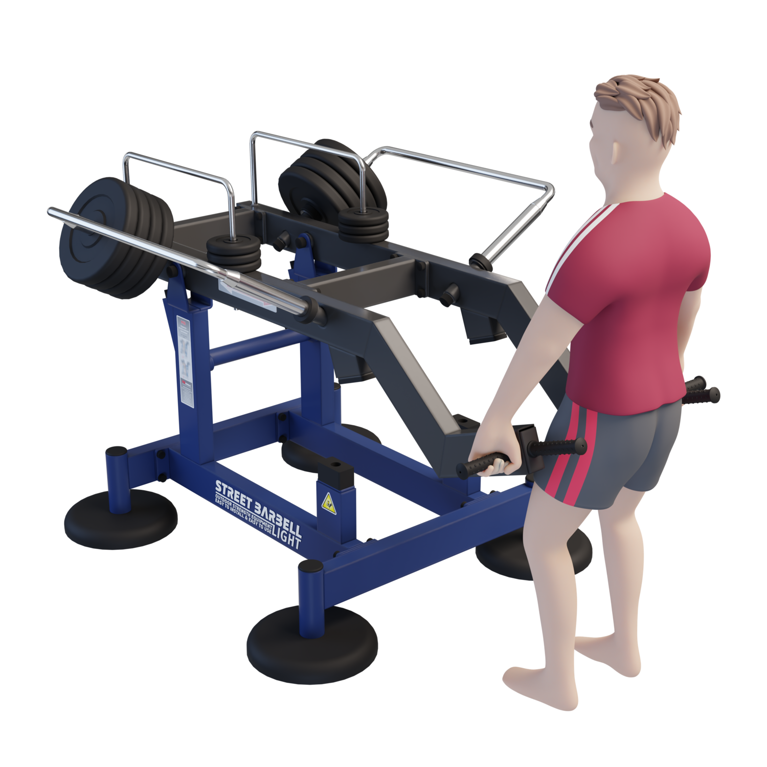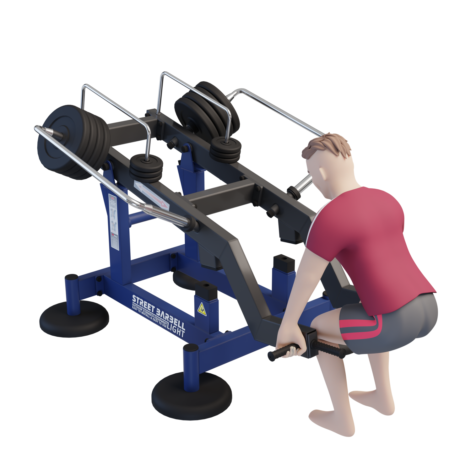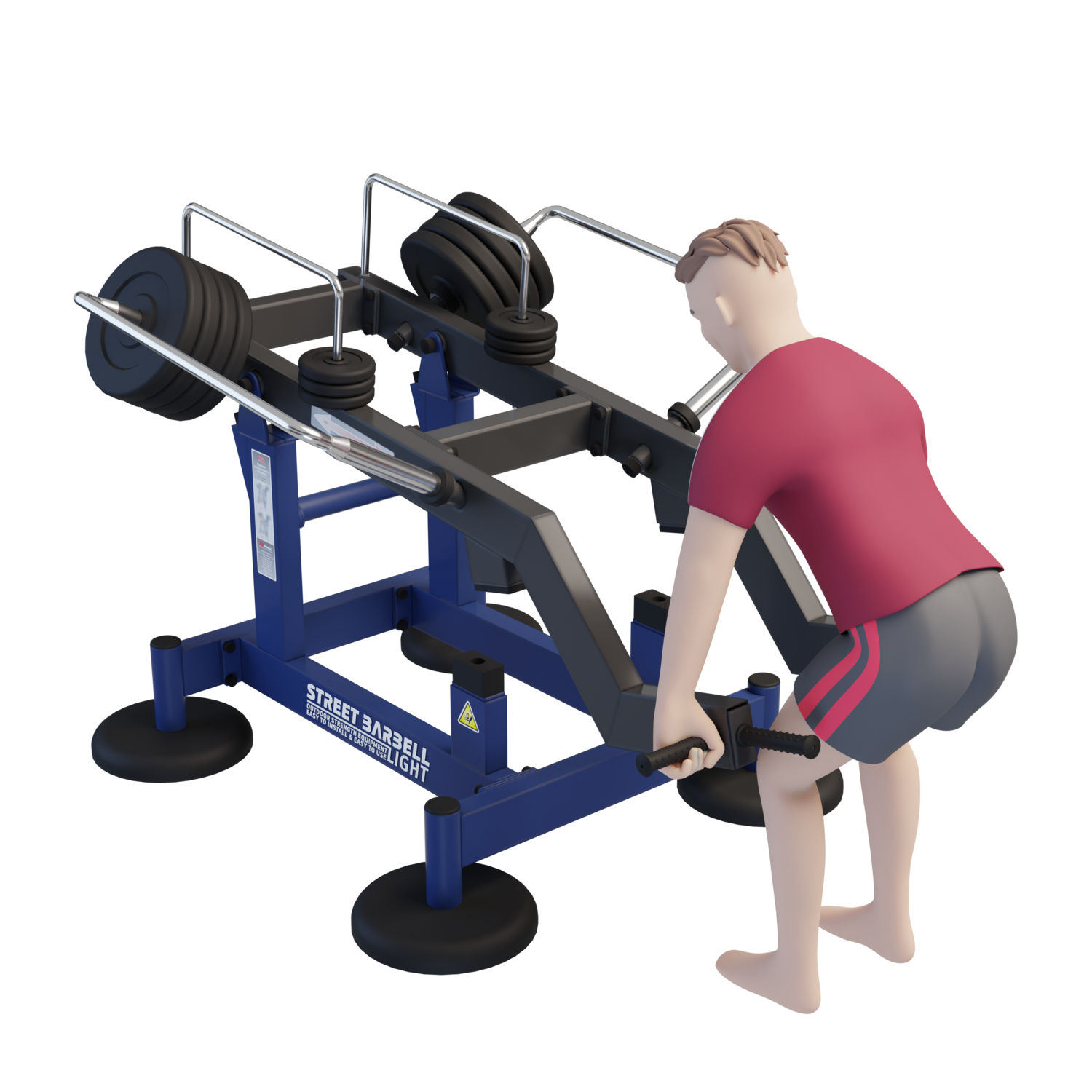 The exercise machine is designed for training back, leg, and forearm muscles. The handles are positioned parallel and perpendicular, allowing simulation of dumbbell and barbell deadlift exercises