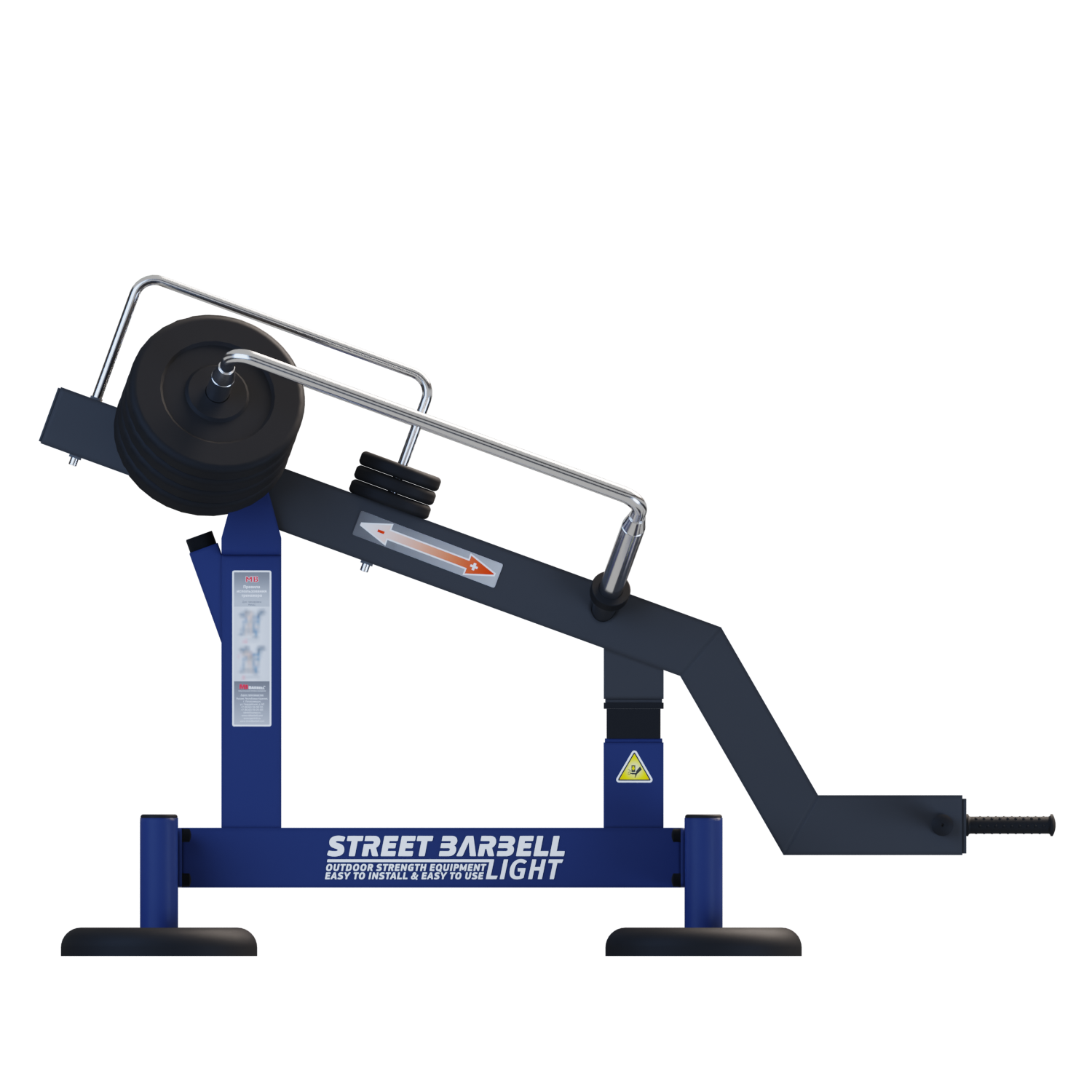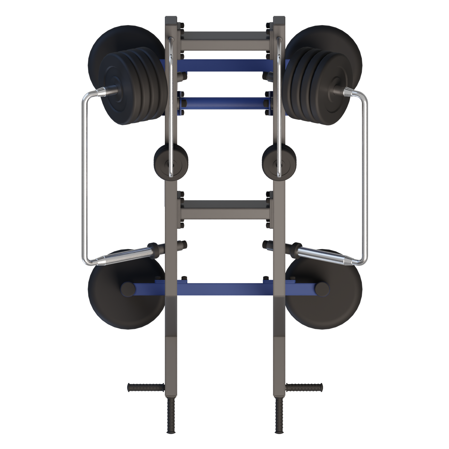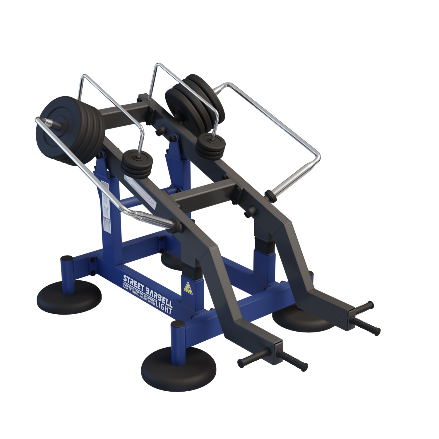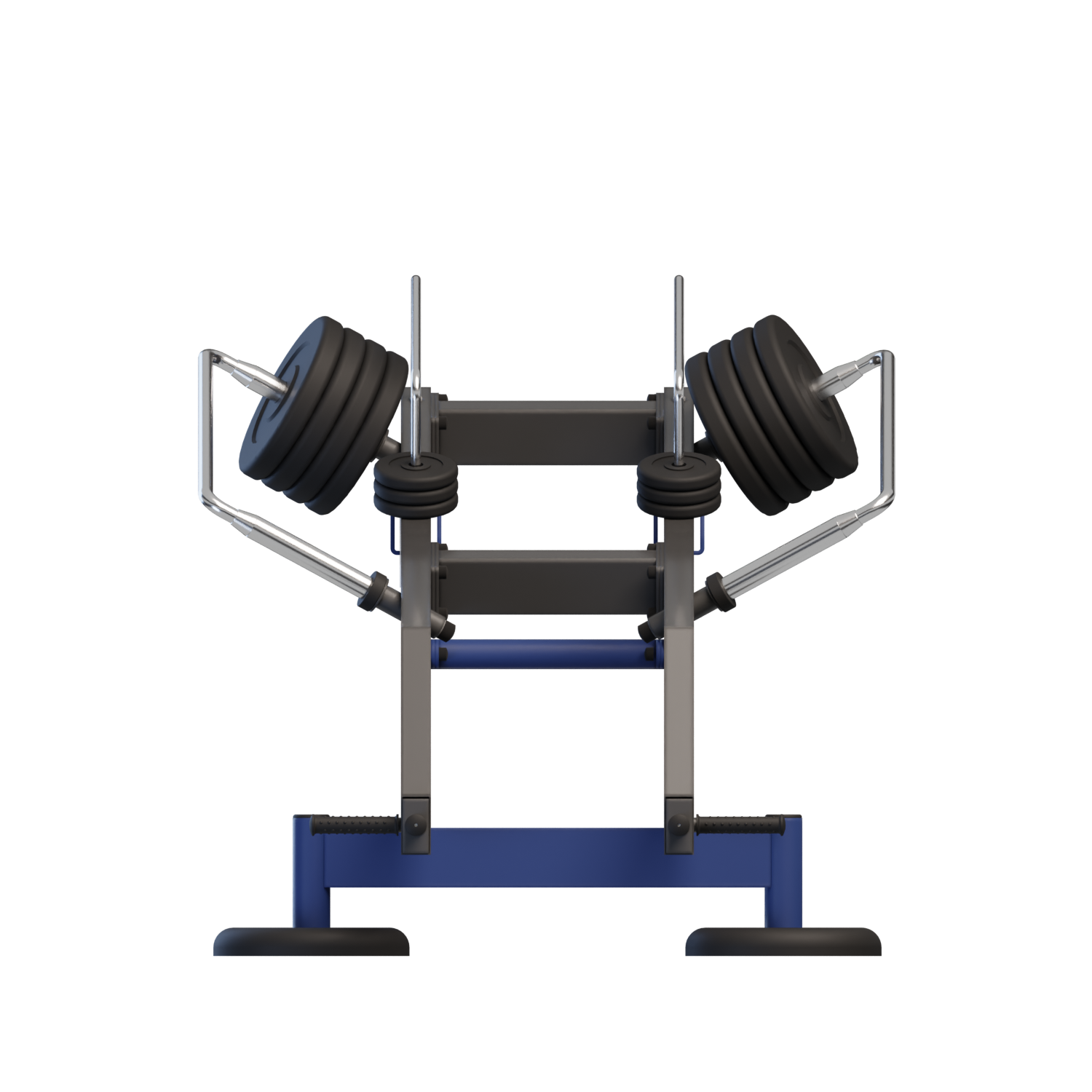 The exercise machine is designed for training back, leg, and forearm muscles. The handles are positioned parallel and perpendicular, allowing simulation of dumbbell and barbell deadlift exercises